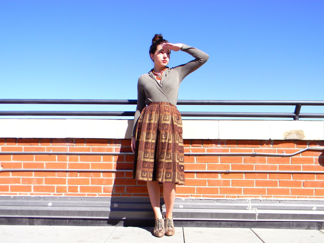 Wow that sky is so blue! I love how your vintage necklace ties in your whole outfit. And that skirt is pretty amazing!